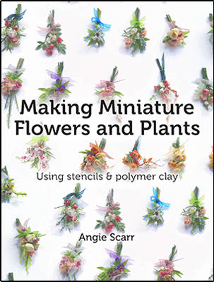 Stencilling with a mix of solid polymer clay and liquid clays is a new adventure for both Angie and her students. A patience-free way to produce the flowers in large enough numbers to fill a dollhouse shop.